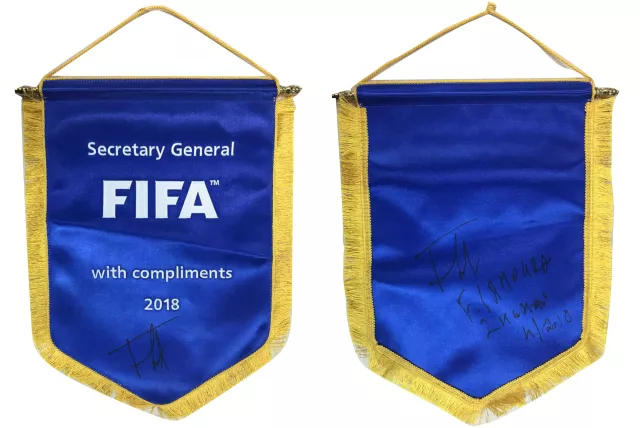(圖:國際足聯(lián)秘書長法特瑪·薩姆拉贈送親筆簽名的國際足聯(lián)會旗)