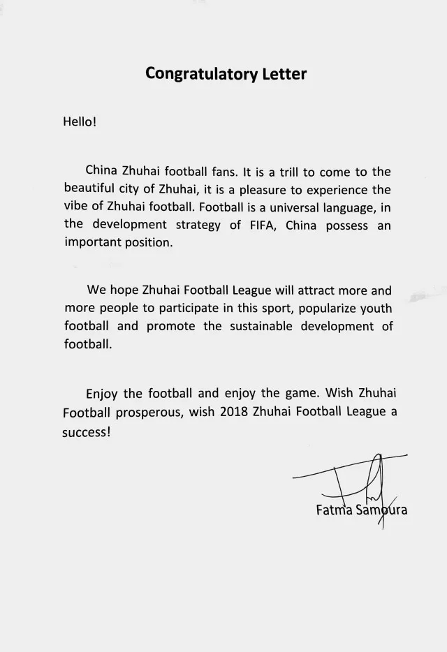 法特瑪·薩姆拉在信中表示,足球是世界通用語言,在國際足聯(lián)的足球發(fā)展戰(zhàn)略中,中國占有重要的地位。期待珠海市足球聯(lián)賽能夠吸引越來越多的人參與到足球這項運動中來,廣泛普及青少年足球運動,促進足球的可持續(xù)發(fā)展。當天上午,soccerex全球足球產業(yè)峰會在會展中心舉行,法特瑪·薩姆拉還向主辦方珠海大橫琴投資有限公司贈送親筆簽名的國際足聯(lián)會旗。