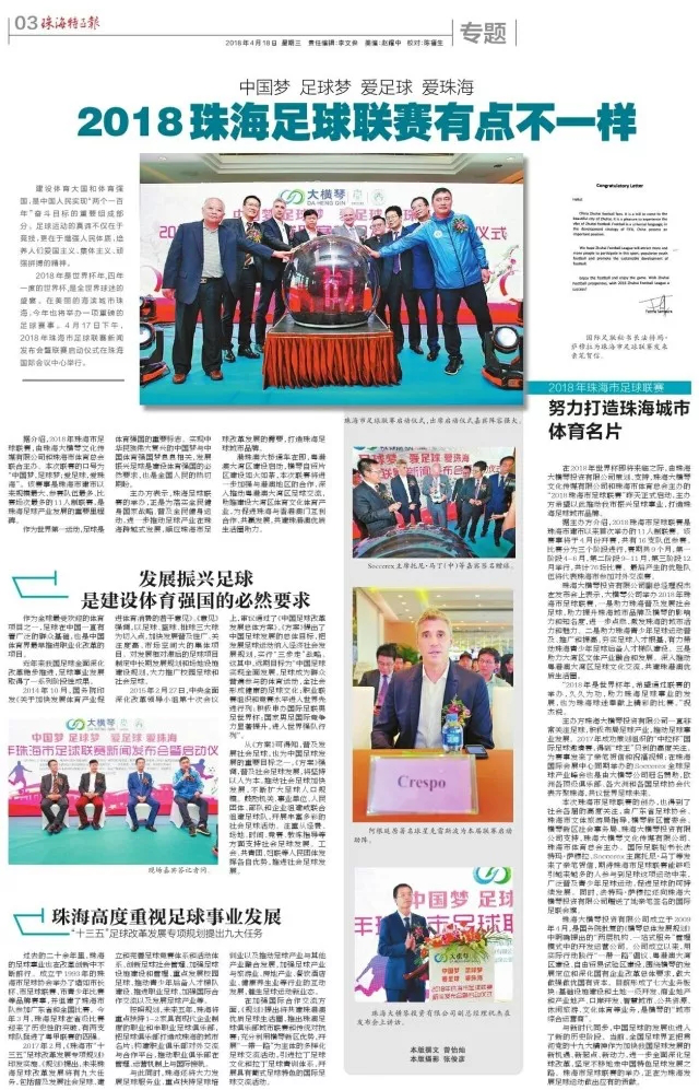 2018年是世界杯年,四年一度的世界杯,是全世界球迷的盛宴。在美麗的海濱城市珠海,今年也將舉辦一項重磅的足球賽事。4月17日下午,由珠海大橫琴投資有限公司策劃、支持,珠海大橫琴文化傳媒有限公司和珠海市體育總會主辦的“2018珠海市足球聯(lián)賽”昨天正式啟動,希望以此推動珠海市足球事業(yè)發(fā)展,打造珠海足球城市品牌。soccerex主席托尼·馬丁,阿根廷前國家隊隊員、傳奇球星克雷斯波,廣東省足球協(xié)會副主席、廣東足球運動中心主任程志文,廣東省政協(xié)委員、澳門中華總商會青年委員會主任馬志達,珠海市文化體育旅游局副局長鄔向明等出席了發(fā)布會并共同見證了聯(lián)賽啟動。
