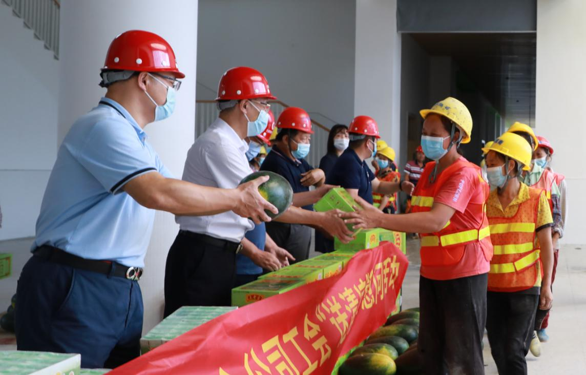 在項目現場,慰問組一行與項目負責人深入交流,詳細了解一線職工工生產生活情況,現場查看施工安全生產、勞動保護和防暑降溫措施,并送上清涼飲料等慰問品。