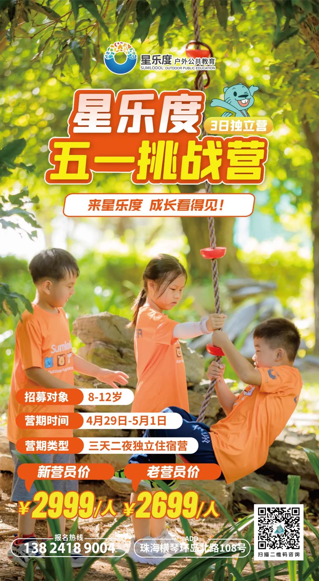 其中,基礎運動營包括自然手作、大自然賓果、科學達人、飛盤運動體驗、“搶雞大戰(zhàn)”、星光營火派對等豐富內容,旨在通過不同的運動項目結合體適能專業(yè)知識,幫助孩子鍛煉身體機能、學會專注、建立團隊意識、提升獨立能力。而升級挑戰(zhàn)營則對營員們的各項能力提出更高要求,營員們將在山林中進行一次屬于勇敢者的探險,通過高空繩索自降、山野定向、皮劃艇濕地挑戰(zhàn)、攀樹實地體驗等項目,跳出舒適圈,克服恐懼,在學習技能、提高自我保護能力及風險意識的同時,享受挑戰(zhàn)帶來的樂趣,塑造堅毅品格(營期信息詳見“星樂度自然成長營地”公眾號)。