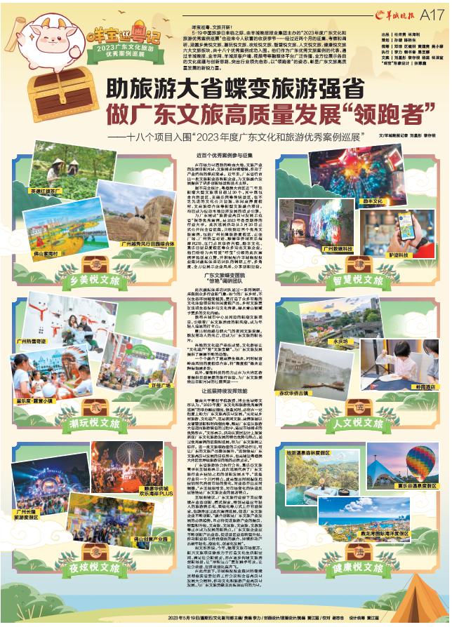 “2023年度廣東文化和旅游優(yōu)秀案例巡展”由羊城晚報報業(yè)集團主辦,旨在為廣東建成“旅游業(yè)高質量發(fā)展示范省”探尋優(yōu)秀案例。此次巡展活動從3月20日正式公開向全省征集,共收到近百個優(yōu)秀文旅案例,包括廣州長隆旅游度假區(qū)、正佳廣場、廣州熱雪奇跡、順德華僑城歡樂海岸PLUS、江門赤坎華僑古鎮(zhèn)、勵豐文化、熹樂谷溫泉度假區(qū)等眾多知名文旅企業(yè)、項目。最終,經(jīng)過近兩個月的征集、考察和調研,包括橫琴星樂度·露營小鎮(zhèn)在內的18個項目正式入圍。