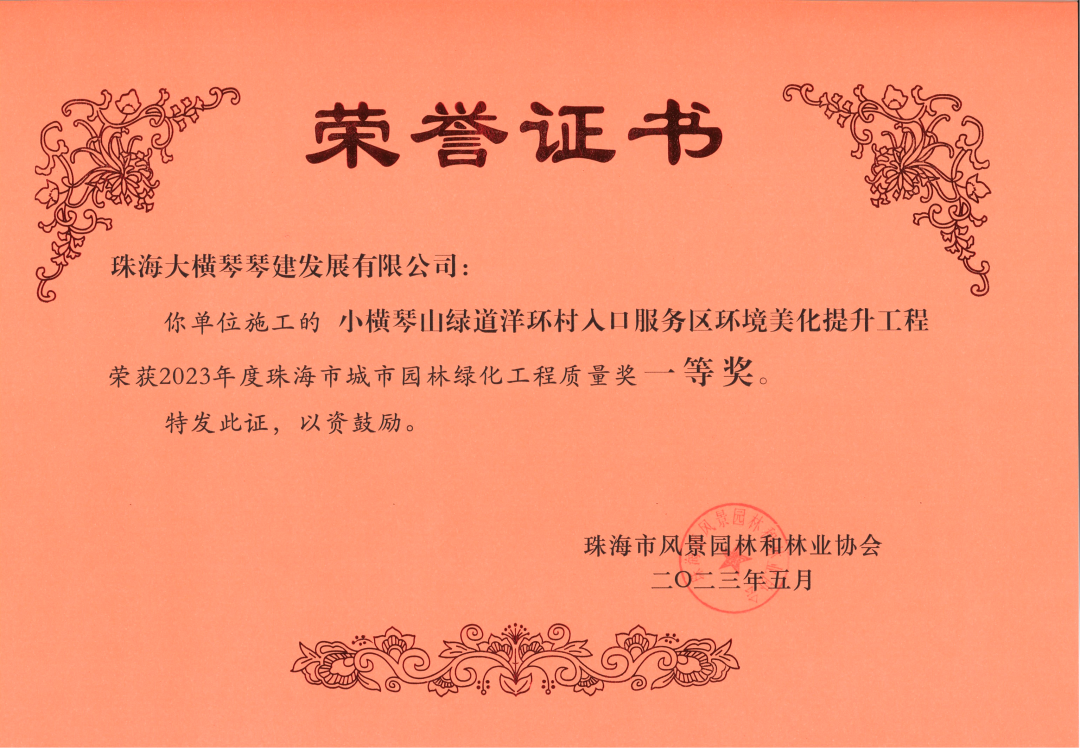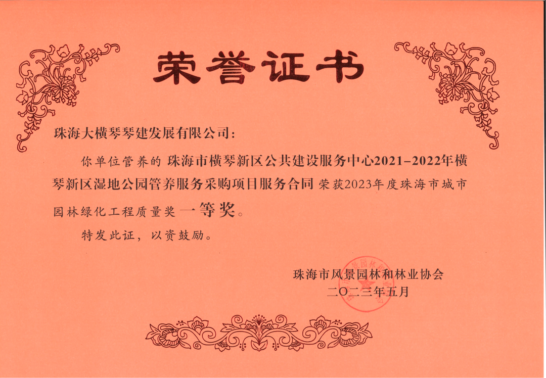 近日,珠海大橫琴琴建發(fā)展有限公司、珠海市橫琴新區(qū)公共建設(shè)服務(wù)中心,2021-2022年橫琴新區(qū)濕地公園管養(yǎng)服務(wù)采購(gòu)項(xiàng)目服務(wù)合同,小橫琴山綠道洋環(huán)村入口服務(wù)區(qū),環(huán)境美化提升工程,以及作為代建單位負(fù)責(zé)建設(shè)的古樹名木公園(粗沙環(huán))項(xiàng)目,榮獲由珠海市風(fēng)景園林和林業(yè)協(xié)會(huì)頒發(fā)的2023年度珠海市城市園林綠化工程質(zhì)量獎(jiǎng)一等獎(jiǎng)。