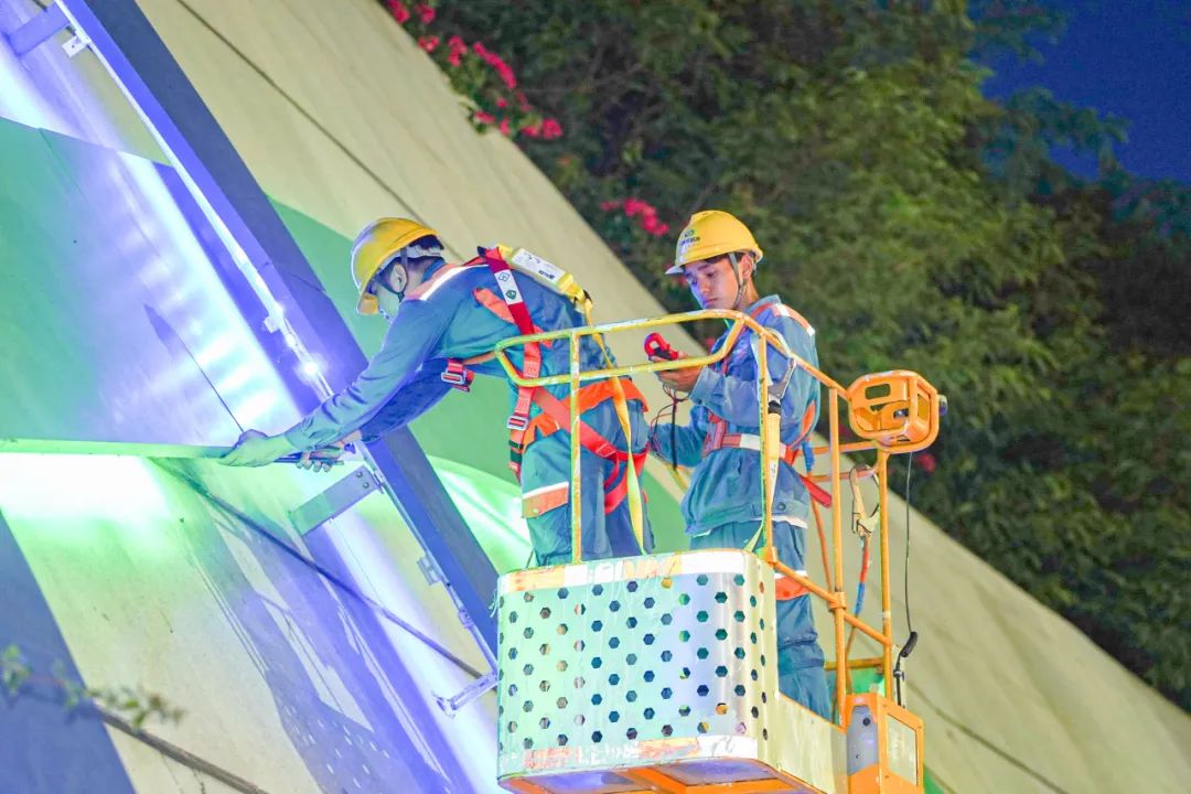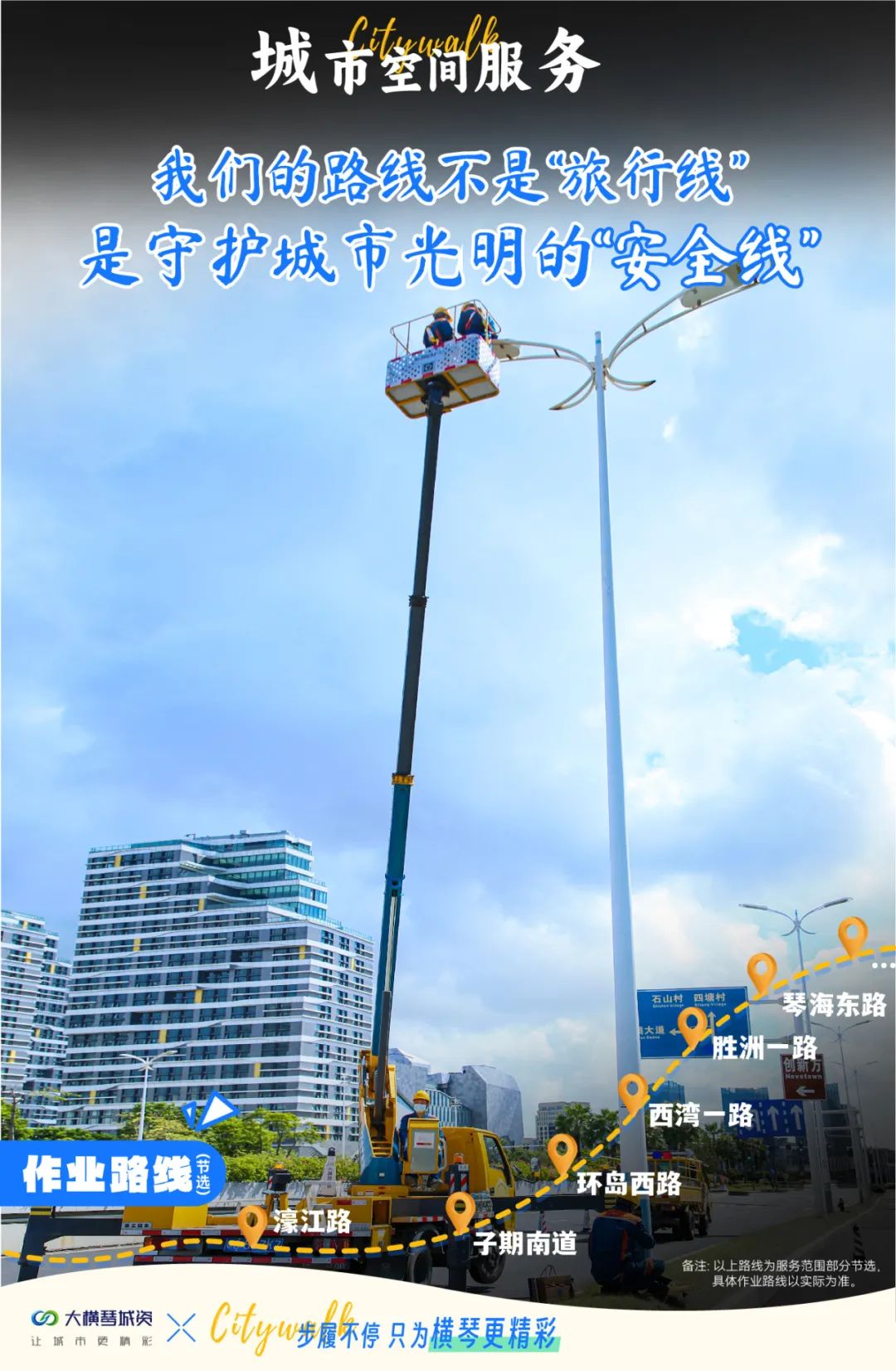 每當夜幕降臨,一盞盞明亮的路燈、一處處別致的亮化景觀,勾勒出了合作區(qū)秀美的輪廓,市民游客在城市街頭Citywalk,他們則在城市高空,2萬余盞路燈、2萬多盞景觀燈,碼頭、立交、橋梁等景觀亮化燈光......都有他們的空中身影,陽光直射之下,腳站高空檢修,暴雨臺風過后,更是以最快速度搶修,他們熟悉橫琴每一盞燈的“脾性”,他們默默守護著城市每個角落的光明。