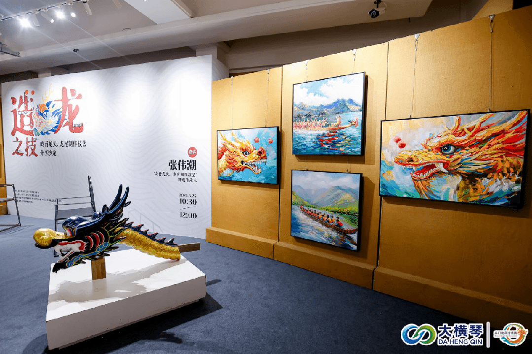 斗門(mén)龍舟賽深厚底蘊(yùn),不僅僅是一場(chǎng)水上競(jìng)渡,更是一系列民俗文化的集大成者。睇龍船、嘆非遺,與比賽同步進(jìn)行的,還有“龍騰黃楊——珠海龍舟民俗文化藝術(shù)展”和傳承人張偉潮分享的“端午龍舟龍頭龍尾制作技藝”沙龍。
