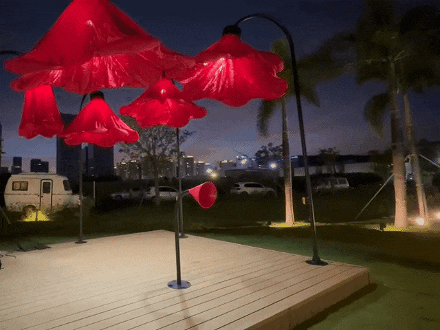 夜晚,當(dāng)游人經(jīng)過,在喇叭裝置處說出“熱烈慶祝中華人民共和國(guó)成立75周年”、“熱烈慶祝澳門回歸祖國(guó)25周年”等祝福語(yǔ)時(shí),花朵會(huì)自動(dòng)打開并亮燈,創(chuàng)造出驚喜的互動(dòng)體驗(yàn)。